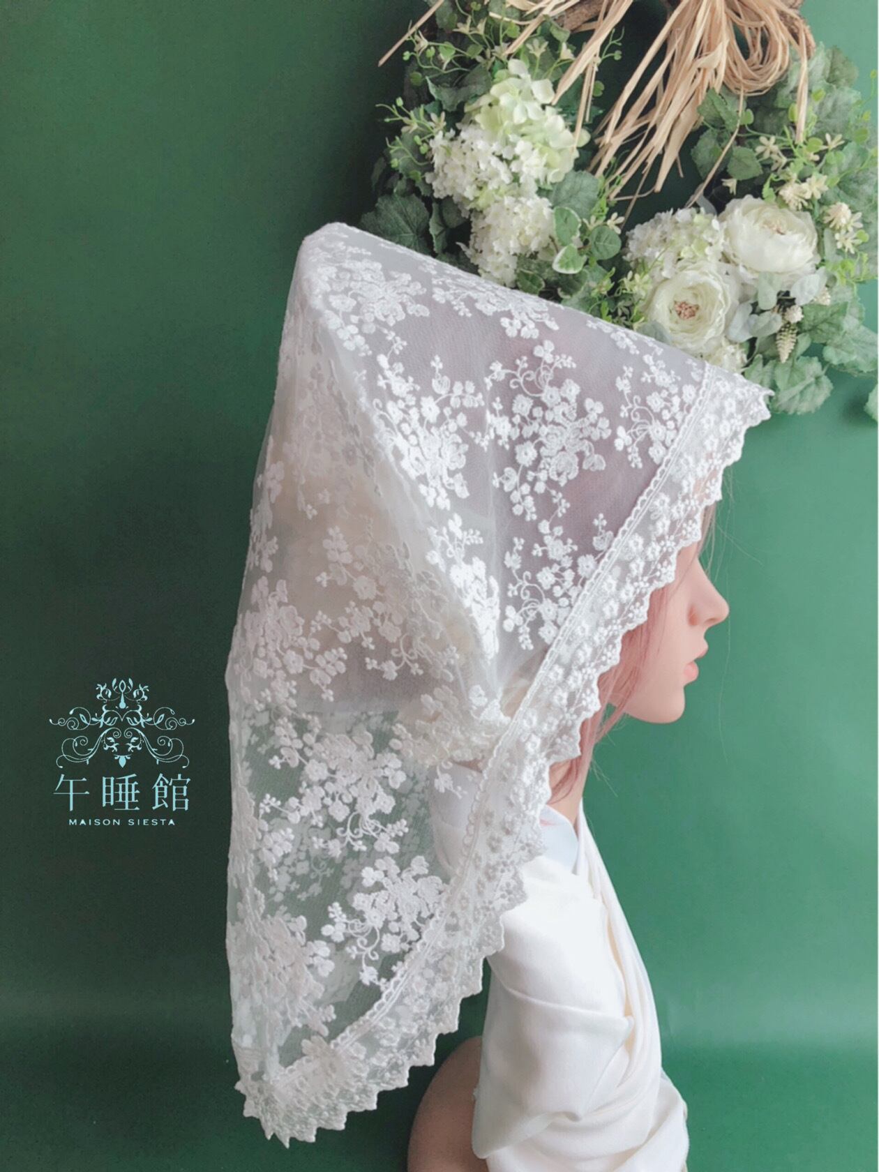 サイドもレースが流れるようにデザインしてあり、マリアベールのような綿帽子に仕上がっています。